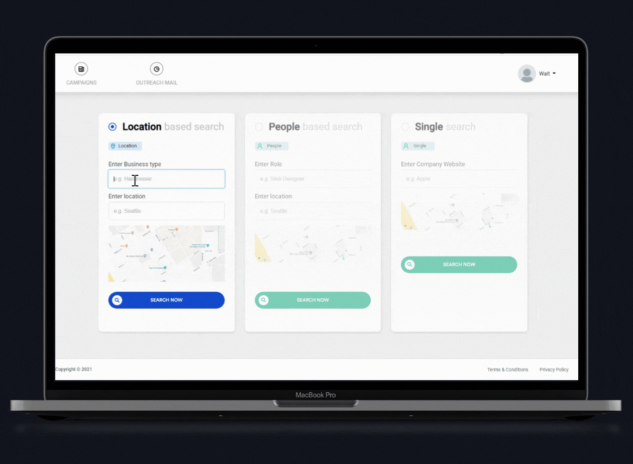 Tell our system about your ideal client and in what city you want to find them, with one click our search intelligence will produce results with their contact information.